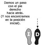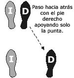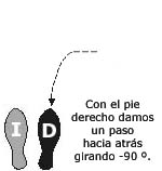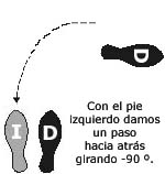 Hacemos lo mismo con el pie derecho, dando un paso atrás y girando –90º y volviendo a la posición inicial y paralelo al pie izquierdo.
