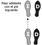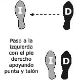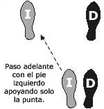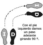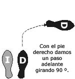 Hacemos lo mismo con el pie izquierdo, damos un paso adelante girando 90º y dejándolo junto al pie derecho (perpendicular a la posición inicial).