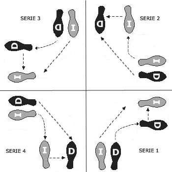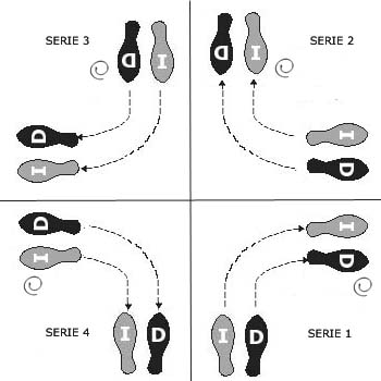 Partiendo de una posición inicial con los pies juntos hacemos la serie uno (pie derecho adelante girando 90º, pie izquierdo adelante girando 90º y paso sobre si mismo con el pie derecho, levantar y apoyar el pie en el mismo sitio).
